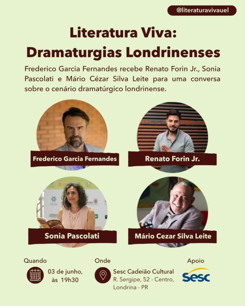 O Literatura Viva – Edição Especial Nº 1, realizado no Sesc Cadeião, teve como tema Dramaturgias Londrinenses e contou com a participação dos professores Mário César Siva Leite (UFMT), Sônia Aparecida Vido Pascolatti (UEL) e Renato Forin Jr. (UEL). A entrevista revisita o movimento teatral dos anos 1970, tratando de grupos como Proteu, Delta e Meta, e a força criativa de Nitis Jacon na consolidação do teatro local. Também foram tratadas temáticas como a resistência artística durante a ditadura, a construção do FILO e a projeção internacional de Londrina no cenário das artes cênicas. O encontro, conduzido por Frederico Garcia Fernandes, reafirmou o teatro como memória, identidade e potência cultural.